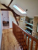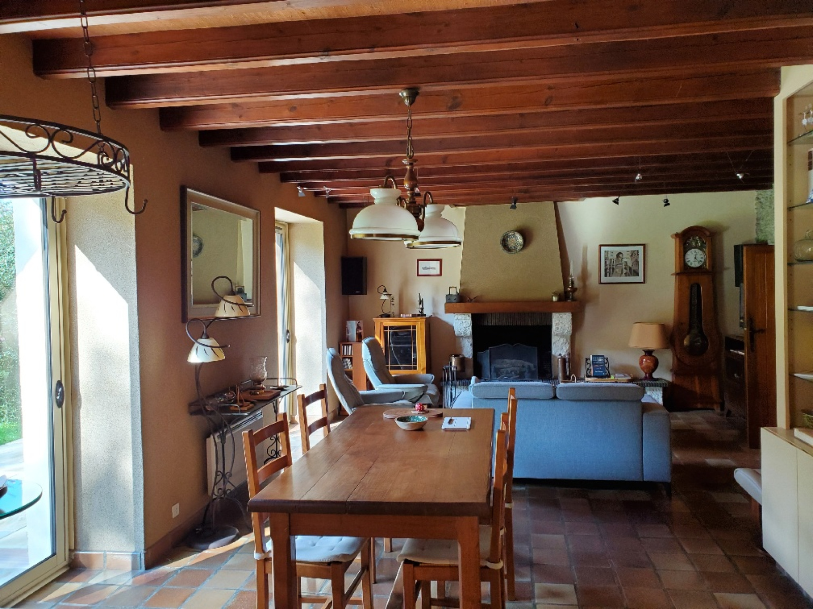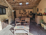 - au rez de chaussée : entrée murs en pierres, séjour avec cheminée et poutres, cuisine équipée à l'américaine, un bureau, une grande arrière-cuisine (ou future chambre), salle d'eau et WC.