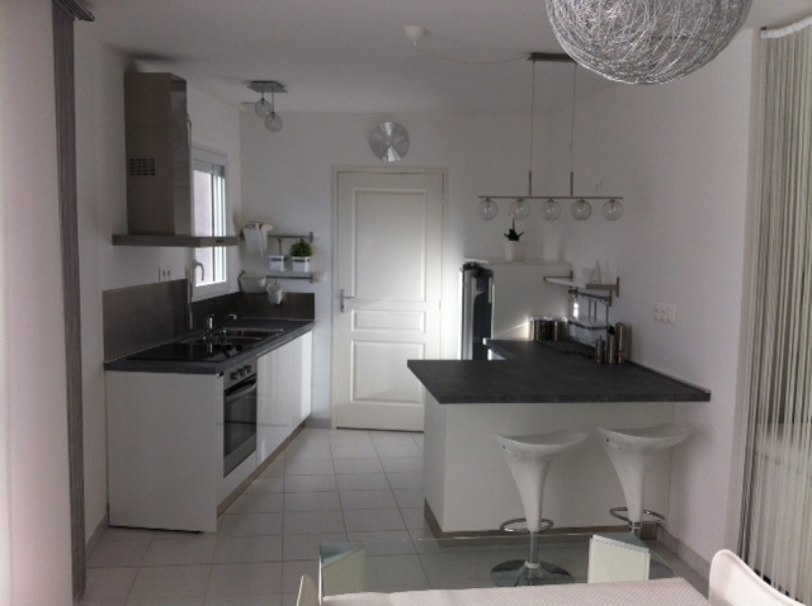 Maison de style moderne de 2013, mitoyenne sur un côté, sise de plain-pied comprenant : entrée sur salle de séjour orientée sud-ouest, cuisine équipée, dégagement desservant trois chambres (dont deux avec placard), salle d'eau WC et un garage pour une voiture. Très bon état, lumineuse et fonctionnelle.